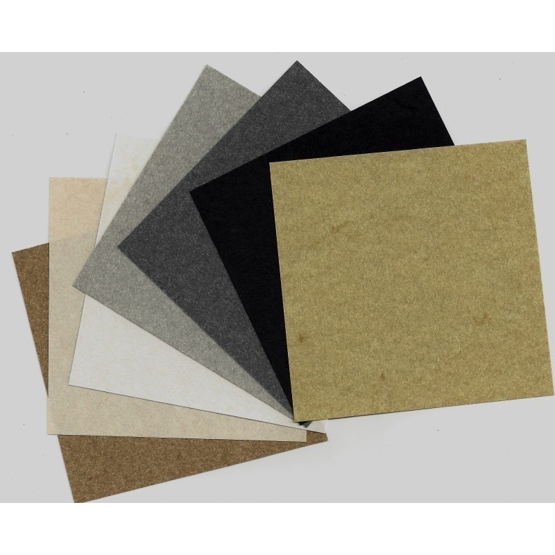 There are 56 sheets of elephant hide paper, eight sheets each of the seven colors. Paper is the same color on each side. Paper size is 95 mm (4,05 inches).