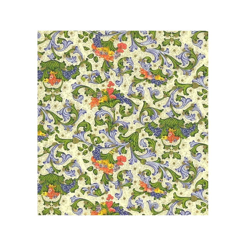 From Rossi A. Cartotecnica in Florence, Italy. This print is inspired by a traditional Florentine Renaissance design. Paper size is 70cm x 100cm (27.5 inches x 39 inches) with dazzling colors and luminous gold metallic accents. Machine made and offset-printed in Italy. Paper base is 100% sulfite, acid free, and printer friendly. Paper is approx 90 g/m2. (This sheet has corner missing)
